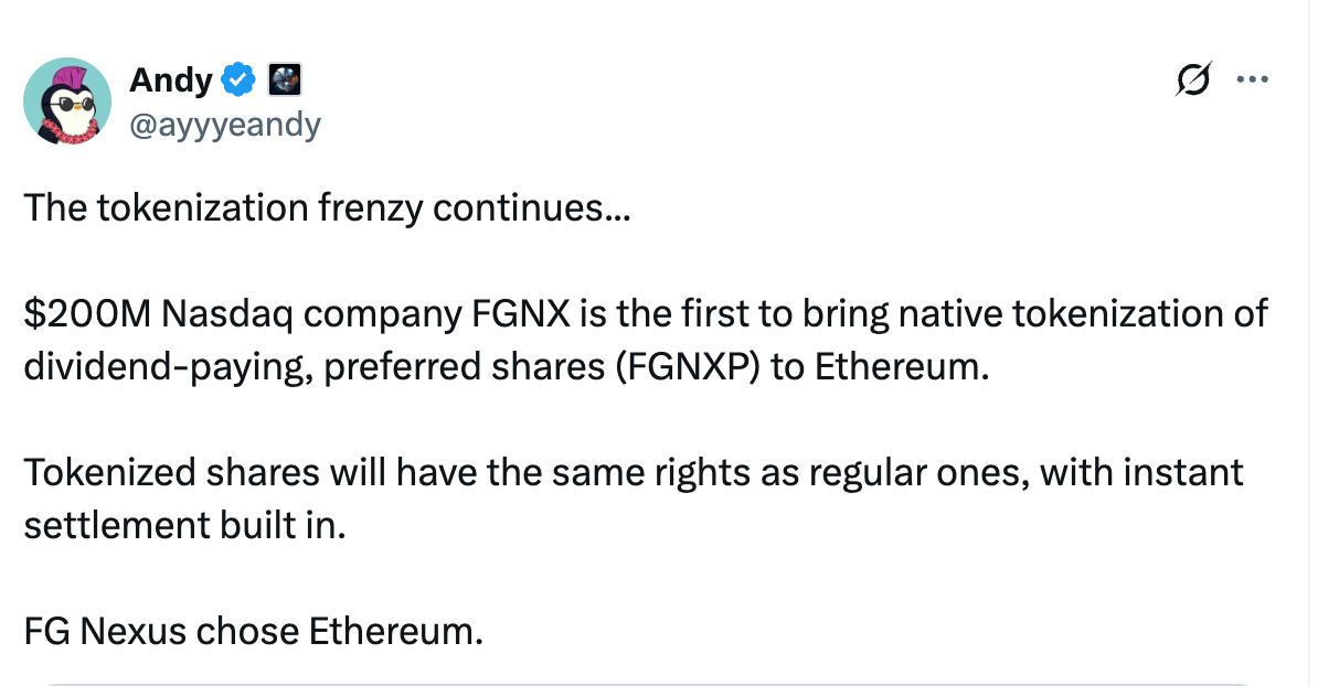 Securitize listed tokenized equity for FGNX on Ethereum, continuing its public-company tokenization track (following previous tokenized shares like KKR fund interests).