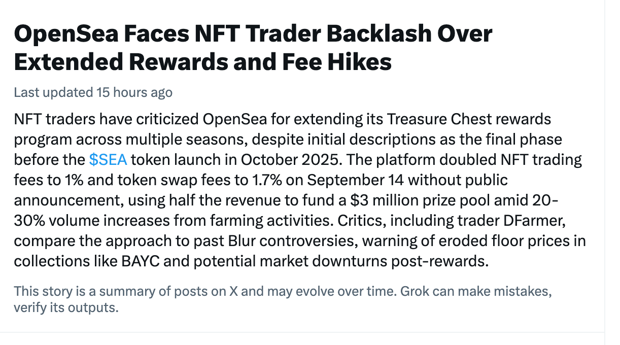 Per Grok: “The platform doubled NFT trading fees to 1% and token swap fees to 1.7% on September 14 without public announcement, using half the revenue to fund a $3 million prize pool amid 20-30% volume increases from farming activities. Critics, including trader DFarmer, compare the approach to past Blur controversies, warning of eroded floor prices in collections like BAYC and potential market downturns post-rewards.”