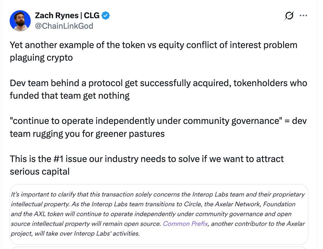 Circle acquires Axelar’s Interop Labs dev team while $AXL token holders get “community governance” and zero claim on the acquisition - Common Prefix taking over development but has no contractual obligation to stay