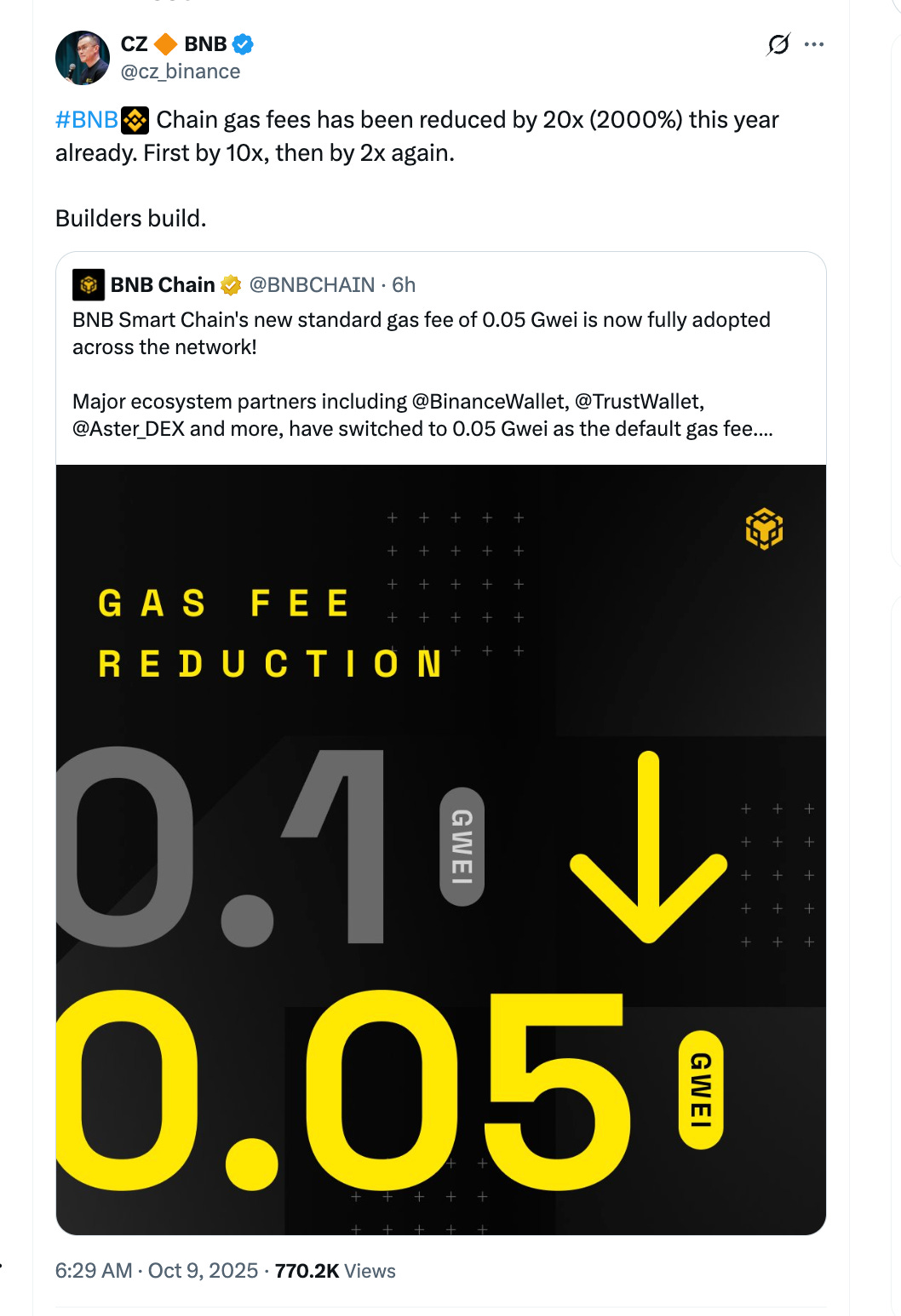 CZ also says “BNB Chain gas fees have been reduced by 2000% this year.”