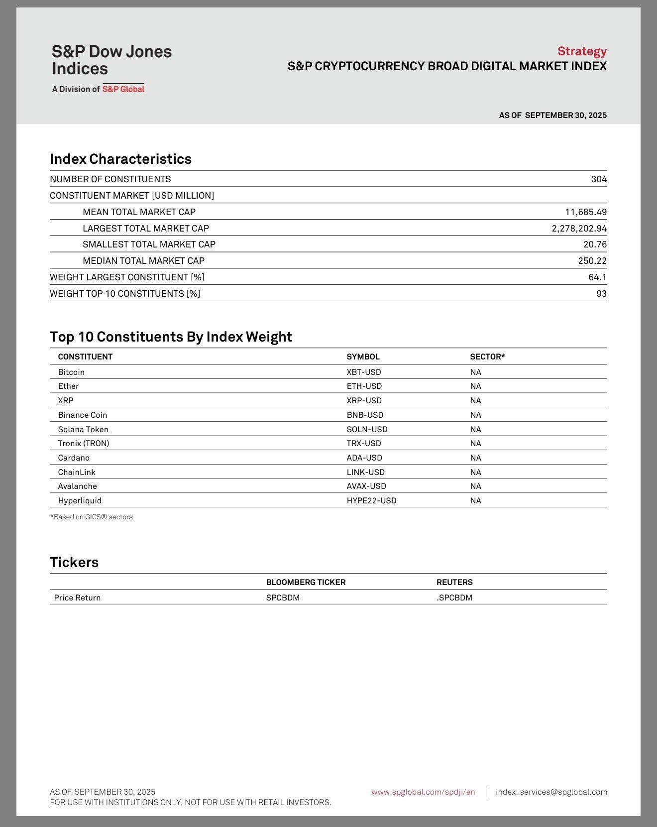 The S&P Digital Markets 50 tracks the top 50 digital assets like a Nasdaq-for-crypto benchmark.