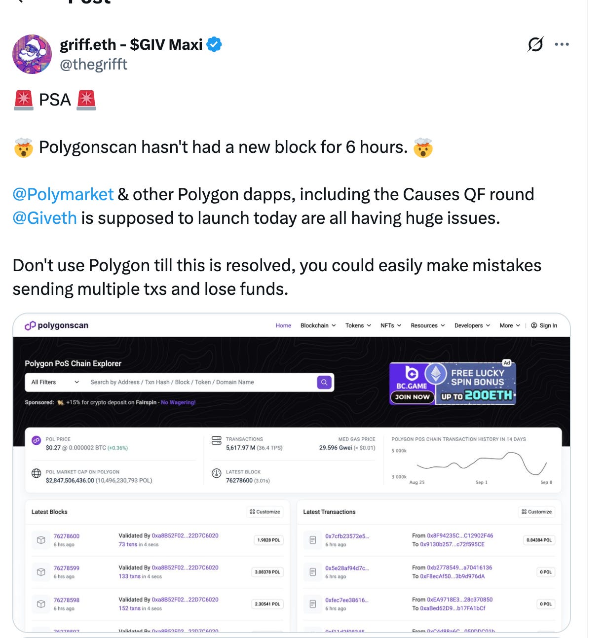 The Polygon network is experiencing transaction finality delays of 10–15 minutes, impacting confirmations despite continuous block production. Latest news say that there hasn’t been a block in several hours.