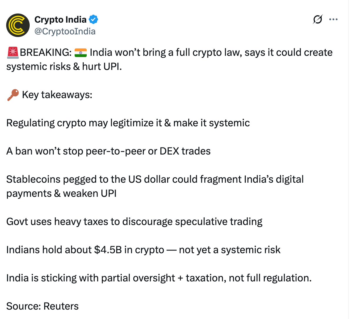 No comprehensive crypto law yet: India is opting to avoid a full legal framework for cryptocurrencies, favoring a partial oversight model. This cautious stance stems from a government document seen by Reuters revealing that the Reserve Bank of India (RBI) considers formal regulation as potentially “legitimizing” crypto and increasing its systemic risk in the financial system.
