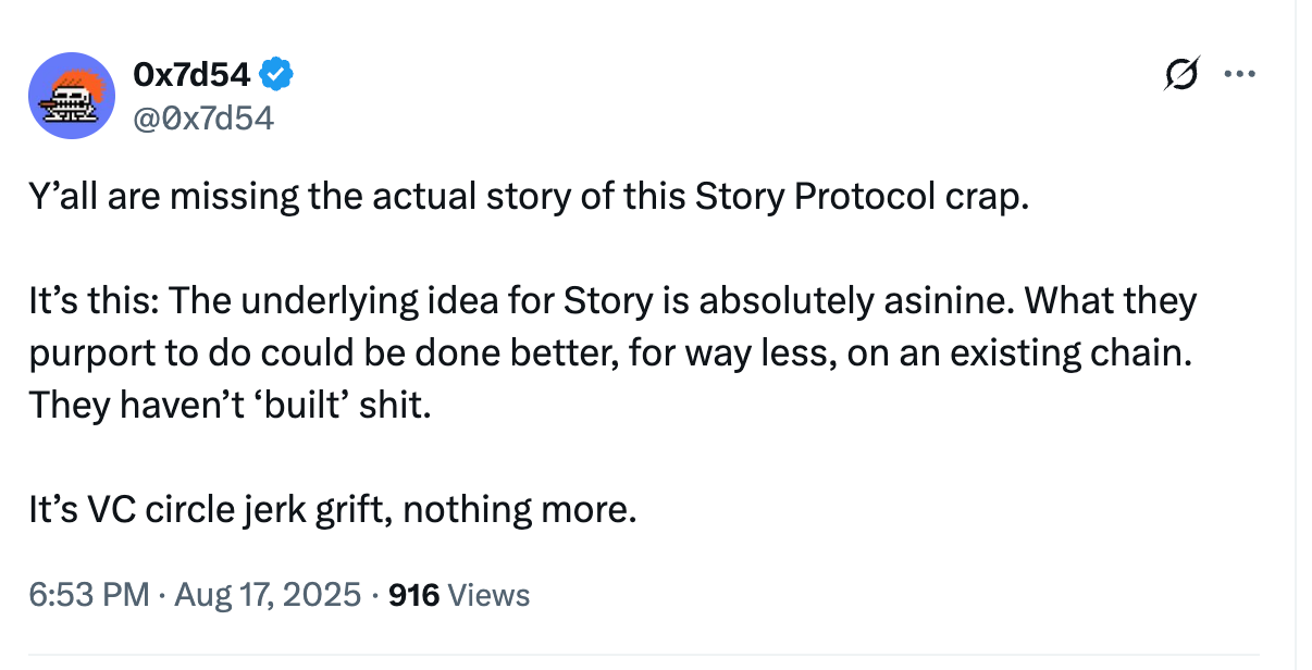 0x7d54 summed it up best: “Story is asinine. What they claim to do could be built cheaper, better, on existing chains. VC circle jerk grift.”