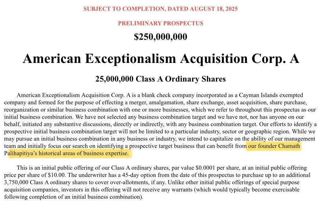 Chamath Palihapitiya (early Bitcoin investor, billionaire) is back with a $250M SPAC — “American Exceptionalism Acquisition Corp A.” Target sectors: DeFi, AI, energy, defense.