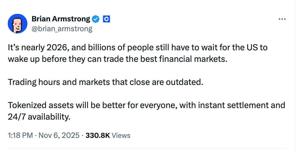 Armstrong argued that trading hours and markets that close are “outdated” and that tokenized assets will be “better for everyone” with instant settlement and 24/7 availability - aka stocks should trade like SOL on a Tuesday