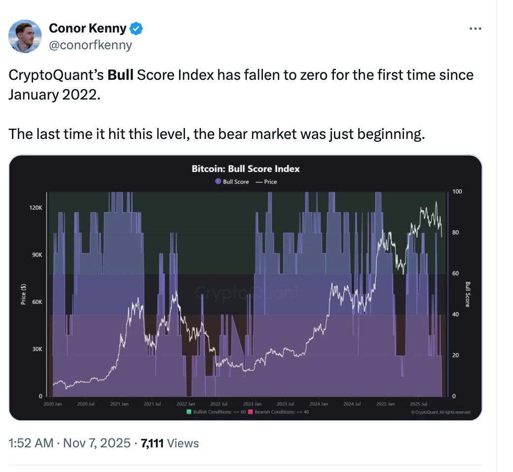 The CryptoQuant Bull Score Index dropped to zero on November 7, marking the first time the indicator has hit this level since January 2022 when BTC was getting bodied around $40K during the post-2021 correction