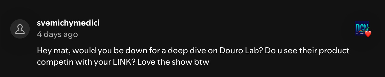 Svemichymedici asked about Douro Labs. They’re a Solana-based dev shop building for the Pyth Network (think Chainlink, but for Solana). Their team comes from Goldman Sachs, Jump Crypto, AWS, and Chorus One. They’re working on tools for Pyth data feeds and have even discussed regulatory applications with the SEC. My take: Solana needs perfect uptime to appeal to institutions—Pyth can’t price data if the chain is down.