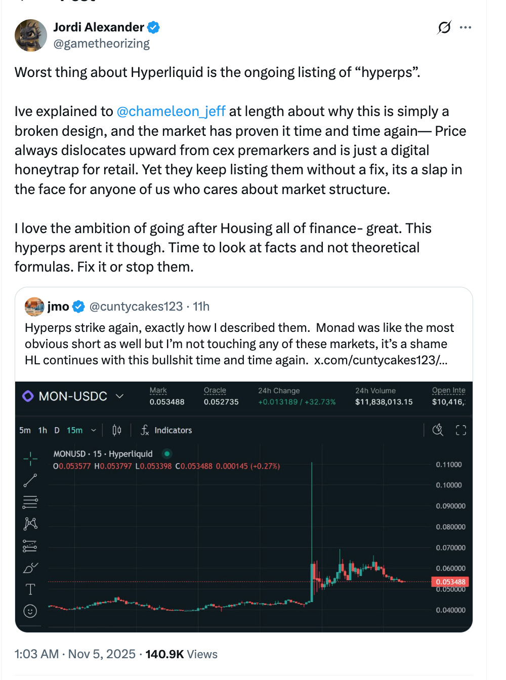A viral X post by trader TradeButWhy on November 4, 2025, compared Hyperliquid’s HYPE token to Solana’s 2022 crash from $260 to $8, warning holders of complacency amid the perp DEX trend. Defenders countered by emphasizing HYPE’s $800 million annualized revenue, 92% buyback allocation, and 9x P/E ratio, contrasting it with Solana’s speculation-driven decline tied to FTX collapse and network issues. As HYPE trades at $36 after a 36% drop from its $59 peak, the debate highlights divisions in crypto sentiment over its long-term resilience.