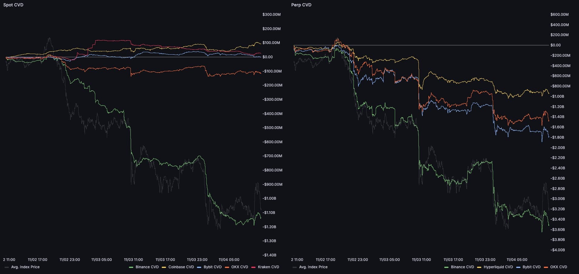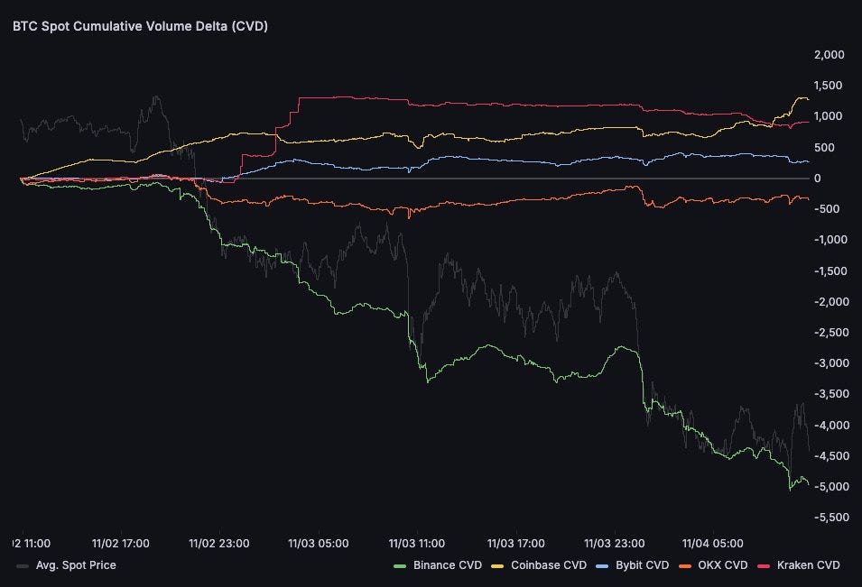 Binance spot CVD dropped from 0 to nearly -5,000 in 48 hours, while other exchanges barely budged — suggesting this isn’t broad-based panic but concentrated selling from one venue