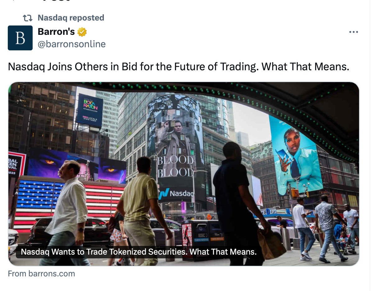 Nasdaq Files SEC Proposal to Trade Tokenized Securities – Seeks approval to allow securities listed on Nasdaq to trade in tokenized form.