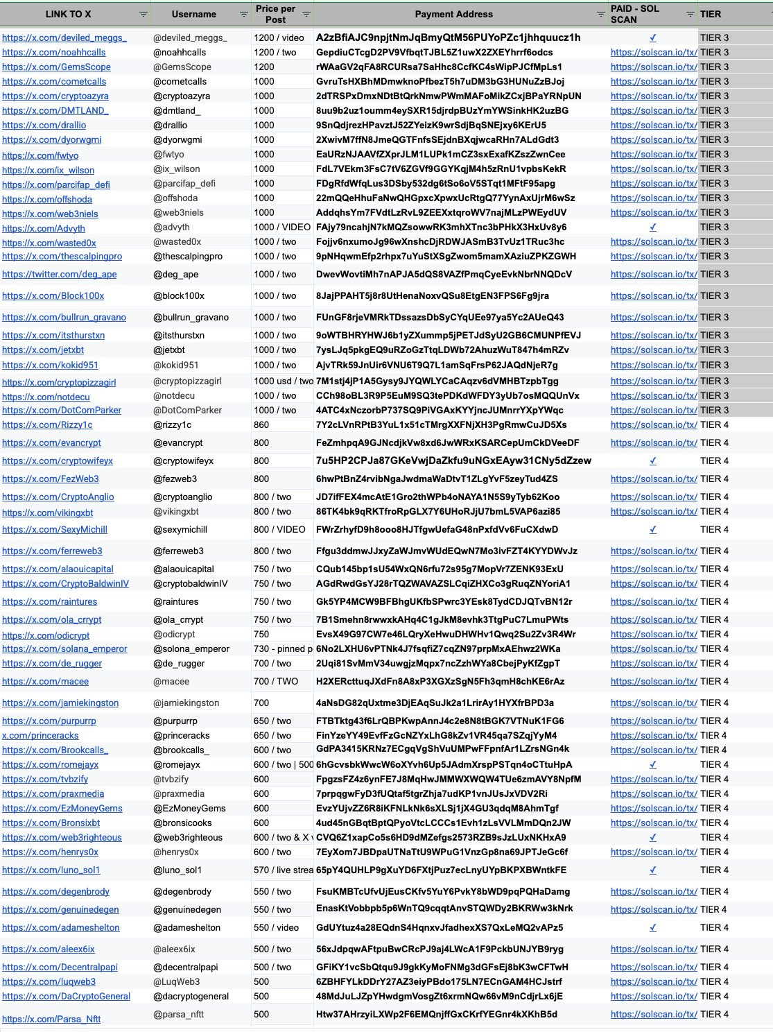 Spreadsheet leak on X [Twitter]: ZachXBT published documents showing rates, wallets, and on-chain receipts for over 200 influencers promoting tokens.