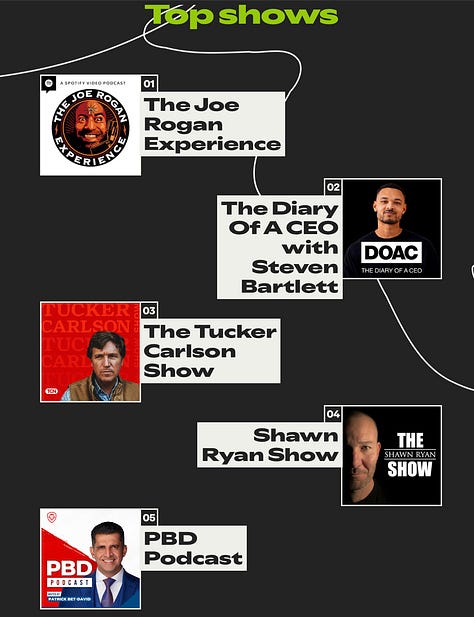 Your top podcasts besides DCN are Joe Rogan, Diary of a CEO, Tucker Carlson, The Sean Ryan Show, and PBD Podcast. That is a right leaning list. No wonder Comrade Kyle gets pushback.