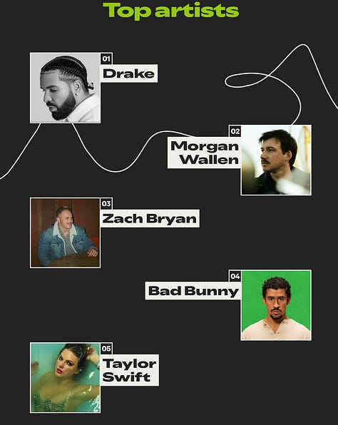 Your top five music artists are Drake, Morgan Wallen, Zach Bryan, Bad Bunny, and Taylor Swift.
