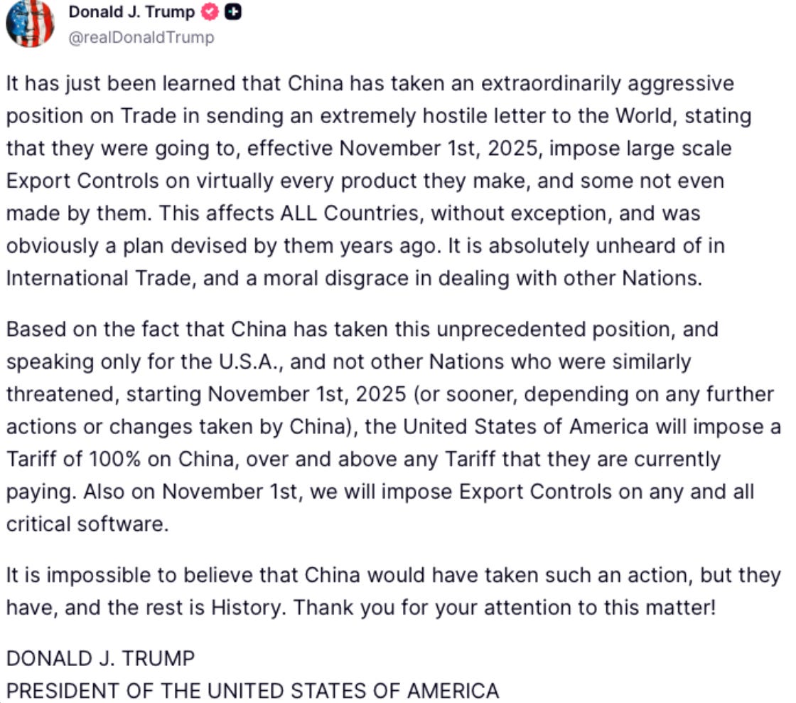 Trump’s 100% China Tariff Tweet Shakes the Market