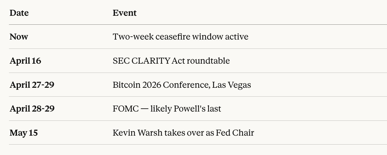 Challenge: Write down one thing today’s price action confirmed about your Bitcoin thesis and one thing it leaves unresolved. The ceasefire has two weeks. The FOMC has three weeks. Warsh has five weeks. Your thesis needs to survive all three. Does it? ⚓